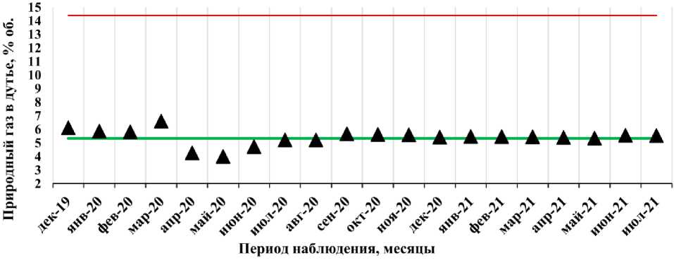 В ходе эксплуатации печи «Аусмелт» сложившиеся среднемесячные содержания природного газа в дутьевой смеси нередко превышают или чаще равны нижнему пределу