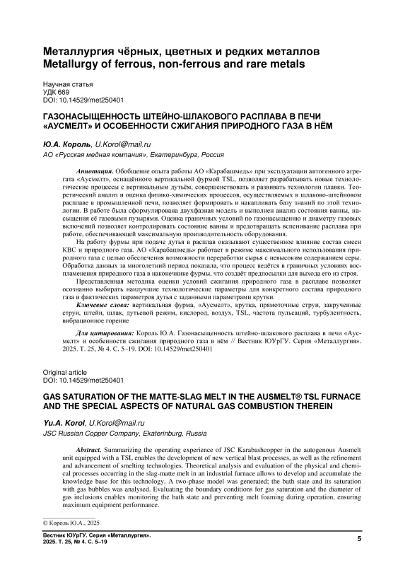 Обобщение опыта работы при эксплуатации автогенного плавильного агрегата «Аус-мелт», оснащённого вертикальной фурмой TSL, позволяет разрабатывать новые технологические процессы с вертикальным дутьём, совершенствовать и развивать осваиваемые технологии плавки в печи в условиях санкций и ограничений в доступе к мировому опыту использования подобного оборудования. Теоретический анализ и оценка физико-химических процессов, осуществляемых в процессе плавки медесодержащего сырья в агрегатах с вертикальным дутьём, позволяет формировать и накапливать базу знаний по этой технологии. В представленной работе была сформулирована модель массообменных процессов и выполнен анализ шлаково-штейновой ванны, насыщения её газовыми пузырями, состоящими как из компонентов дутья, так и продуктов окислительных реакций. Оценка пограничных условий по газонасыщению и диаметру газовых включений позволяет контролировать состояние ванны и предотвращать вспенивание расплава при работе в условиях форсированной плавки.
