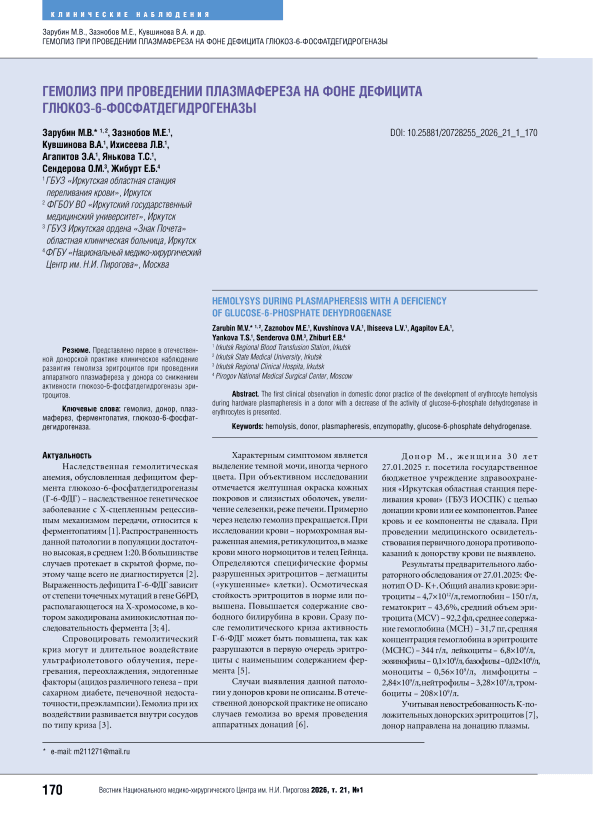 Текст научной статьи Гемолиз при проведении плазмафереза на фоне дефицита глюкоз-6-фосфатдегидрогеназы