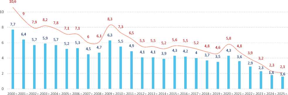 Рис. 1. Динамика уровня безработицы и численности безработных в России в XXI веке* * За 2025 год приведены данные за август 2025 года, актуальные на момент подготовки статьи. Источник: Рабочая сила, занятость и безработица в России (по результатам выборочных обследований рабочей силы) (2024): статистический сборник / Росстат. Mосква. 152 c.