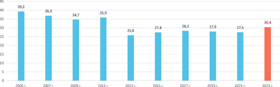 Рис. 2. Гендерный разрыв в оплате труда (ГРОТ) на российском рынке труда в 2005–2023 гг. (зарплата женщин, % от зарплаты мужчин)