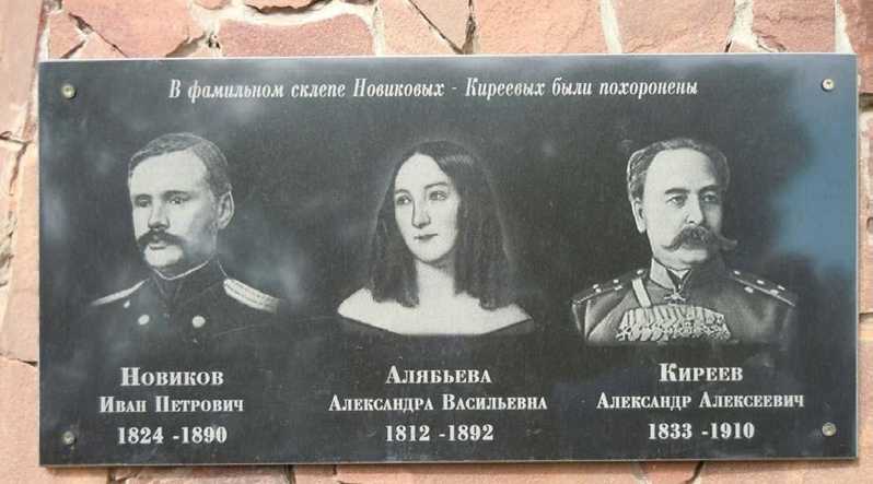 Памятная табличка в с. Новиково (бывшая Ново-Александровка) Староюрьевского р-на Тамбовской обл. на месте фамильного склепа Новиковых-Киреевых, который находился в уничтоженном в советские годы Иоанно-Богословском храме