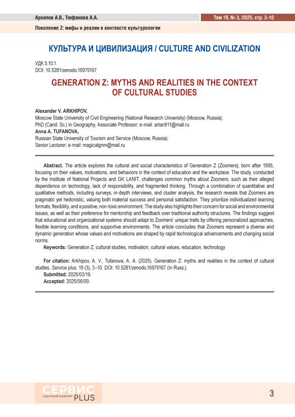 The article explores the cultural and social characteristics of Generation Z (Zoomers), born after 1995, focusing on their values, motivations, and behaviors in the context of education and the workplace. The study, conducted by the Institute of National Projects and GK LANIT, challenges common myths about Zoomers, such as their alleged dependence on technology, lack of responsibility, and fragmented thinking. Through a combination of quantitative and qualitative methods, including surveys, in-depth interviews, and cluster analysis, the research reveals that Zoomers are pragmatic yet hedonistic, valuing both material success and personal satisfaction. They prioritize individualized learning formats, flexibility, and a positive, non-toxic environment. The study also highlights their concern for social and environmental issues, as well as their preference for mentorship and feedback over traditional authority structures. The findings suggest that educational and organizational systems should adapt to Zoomers’ unique traits by offering personalized approaches, flexible learning conditions, and supportive environments. The article concludes that Zoomers represent a diverse and dynamic generation whose values and motivations are shaped by rapid technological advancements and changing social norms.