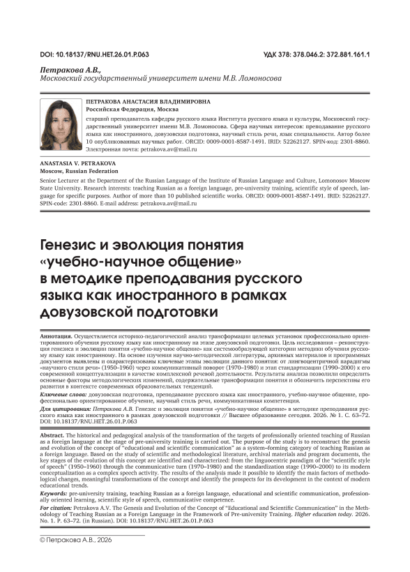 The historical and pedagogical analysis of the transformation of the targets of professionally oriented teaching of Russian as a foreign language at the stage of pre-university training is carried out. The purpose of the study is to reconstruct the genesis and evolution of the concept of “educational and scientific communication” as a system–forming category of teaching Russian as a foreign language. Based on the study of scientific and methodological literature, archival materials and program documents, the key stages of the evolution of this concept are identified and characterized: from the linguocentric paradigm of the “scientific style of speech” (1950–1960) through the communicative turn (1970–1980) and the standardization stage (1990–2000) to its modern conceptualization as a complex speech activity. The results of the analysis made it possible to identify the main factors of methodological changes, meaningful transformations of the concept and identify the prospects for its development in the context of modern educational trends.