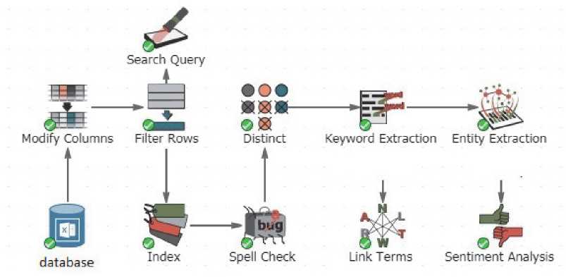 The node «columns modification» allows changing the reviews column format from a linear one to a textual one, which allows working with more complex nodes in the future. The node “ indexation ” serves for dividing texts into paragraphs and sentences and attributing each word to a definite part of speech. It improves the working with faster. The procedure of spelling check is obligatory while the confidence threshold for this database is 70 %. The nodes “unique texts” and “unique notes” result in the table from which reviews of the same or similar content have been eliminated. All the necessary procedures make the research database better prepared for data processing.