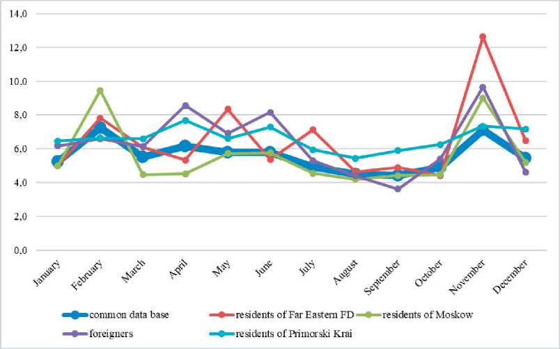 Fig. 11- Seasonal changes in the sentiment index (the category of Primorsky Krai target groups)