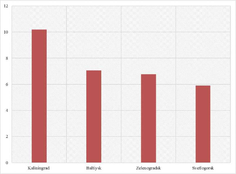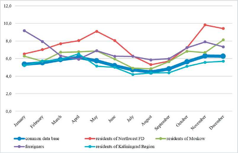 In the Kaliningrad Region tourist stream is evenly distributed between seasons, so that changes in the index are insignificant throughout the year (Figure 12).