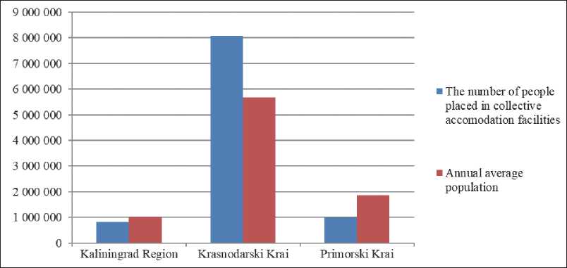 It is possible to assess the overall level of tourism development in Primorsky Krai and in the Kaliningrad Region by comparing the indexes of tourism industry with those of the leader region - Krasnodarski Krai. In the course of analyzing the contemporary state of tourism in the regions under research it is necessary to note that in Krasnodarski Krai the number of people accommodated in collective accommodation facilities exceeds the population by 42 % ( Figure 2).