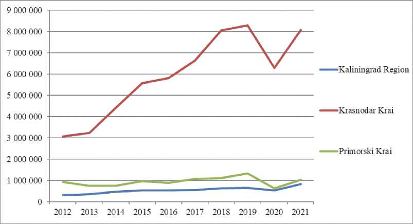Also statistical analysis of tourism sphere development in the Kaliningrad Region, in Primorsky Krai, and in Krasnodar Krai is made.