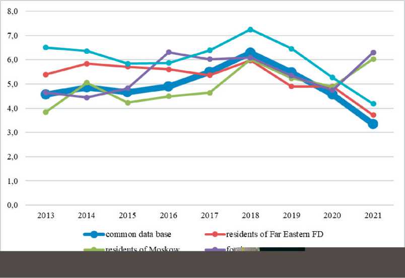 In 2021 in the Kaliningrad Region, the index of the number of people accommodated exceeded the pre-pandemic index, Primorsky Krai and Krasnodarsky Krai got close to the indices of 2018 (Figure 3).