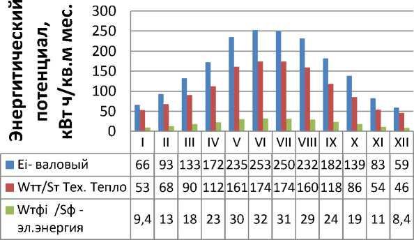 Расчитаны распределение валового и технического потенциалов солнечной энергии при преобразовании в тепловую энергию и электрическую в Центральных Каракумах по месяцам (кВт·ч/м2в мес.) гистограмма приведена на рисунке 2.