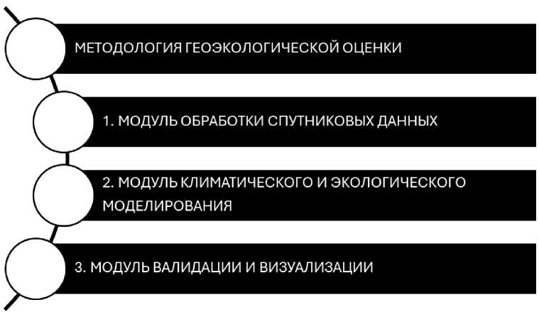 Методологическая основа исследования опирается на сочетание дистанционного мониторинга, информационно-симуляционного моделирования и методов полевой валидации, интегрированных в передовой программный комплекс, разработанный специально для геоэкологической оценки городских территорий. Система имеет модульную структуру и включает три основных подсистемы: (1) модуль обработки спутниковых данных, (2) модуль климатического и экологического моделирования и (3) модуль валидации и визуализации [рис.1] [2].