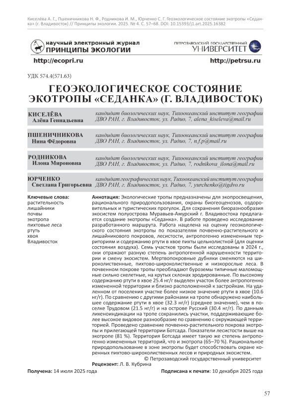 Экологические тропы предназначены для экопросвещения, рационального природопользования, охраны биогеоценозов, оздоровительных и туристических прогулок. Для сохранения биоразнообразия экосистем полуострова Муравьев-Амурский г. Владивостока предлагается создание экотропы «Седанка». В работе проведено исследование разработанного маршрута. Работа нацелена на оценку геоэкологического состояния экотропы по показателям почвенно-растительного и лишайникового покровов, лесистости, антропогенно измененным территориям и содержанию ртути в хвое пихты цельнолистной (для оценки состояния воздуха). Семь участков тропы были исследованы в 2024 г., они отражают разную степень антропогенной нарушенности территории и смену экосистем. Мертвопокровные дубняки сменяются на широколиственные, пихтово-широколиственные и низкорослые леса. В почвенном покрове тропы преобладают буроземы типичные маломощные сильно скелетные, на крутых склонах эродированные. По высокому содержанию ртути в хвое 25.4 нг/г выделен участок более антропогенно измененной территории и близко расположенной к застройкам. На удаленном от поселения участке более низкое значение ртути в хвое (10.6 нг/г). По сравнению с другими районами на тропе обнаружено наибольшее содержание ртути в хвое (32.3 нг/г) (среднее значение), чем в поселке Трудовом (21.5 нг/г) и на острове Русский (30.4 нг/г). По данным лихеноиндикации на тропе сохранились участки, поддерживающие более высокое видовое разнообразие по сравнению с окружающей территорией. Проведено сравнение почвенно-растительного покрова экотропы и прилегающей территории Ботсада. Показатели лесистости выше на экотропе (81 %). Территория Ботсада имеет такую же степень антропогенно измененных территорий, что и экотропа (65–70 %). Рациональное природопользование в зоне экотропы будет способствовать охране коренных пихтово-широколиственных лесов и природных экосистем.