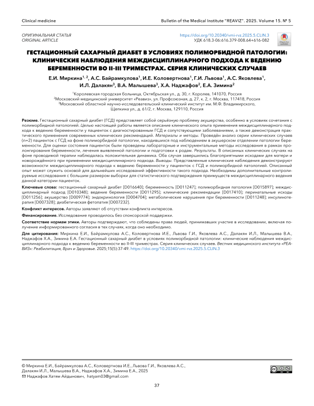 Гестационный сахарный диабет (ГСД) представляет собой серьёзную проблему акушерства, особенно в условиях сочетания с полиморбидной патологией. Целью настоящей работы является описание клинического опыта применения междисциплинарного подхода к ведению беременности у пациенток с диагностированным ГСД и сопутствующими заболеваниями, а также демонстрация практического применения современных клинических рекомендаций. Материалы и методы. Проведён анализ серии клинических случаев (n=2) пациенток с ГСД на фоне полиморбидной патологии, находившихся под наблюдением в акушерском отделении патологии беременности. Для оценки состояния пациенток были проведены лабораторные и инструментальные методы исследования в рамках пролонгирования беременности, лечения выявленной патологии и подготовки к родам. Результаты. В описанных клинических случаях на фоне проводимой терапии наблюдалась положительная динамика. Оба случая завершились благоприятными исходами для матери и новорождённого при применении междисциплинарного подхода. Выводы. Представленные клинические наблюдения демонстрируют возможности междисциплинарного подхода к ведению беременности у пациенток с ГСД и полиморбидной патологией. Описанный опыт может служить основой для дальнейших исследований эффективности такого подхода. Необходимы дополнительные контролируемые исследования с большим размером выборки для статистического подтверждения преимуществ междисциплинарного ведения данной категории пациенток.