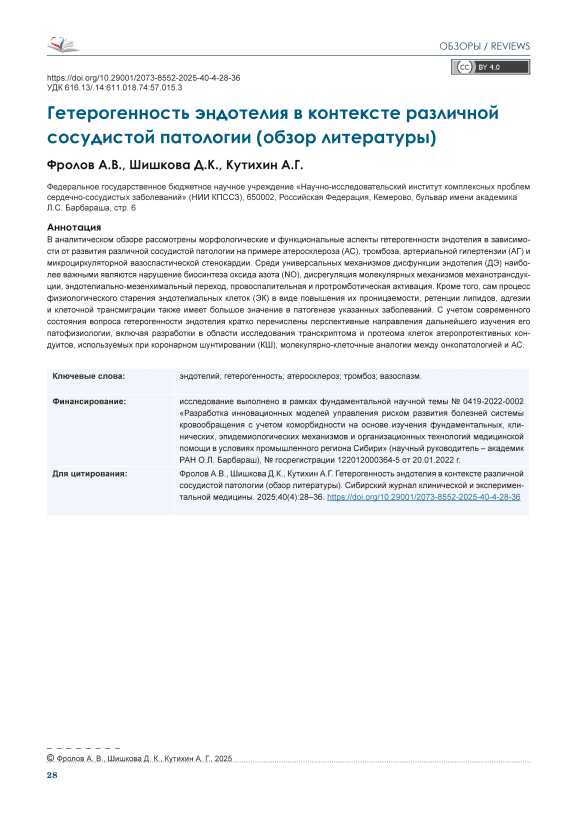 В аналитическом обзоре рассмотрены морфологические и функциональные аспекты гетерогенности эндотелия в зависимости от развития различной сосудистой патологии на примере атеросклероза (АС), тромбоза, артериальной гипертензии (АГ) и микроциркуляторной вазоспастической стенокардии. Среди универсальных механизмов дисфункции эндотелия (ДЭ) наиболее важными являются нарушение биосинтеза оксида азота (NO), дисрегуляция молекулярных механизмов механотрансдукции, эндотелиально-мезенхимальный переход, провоспалительная и протромботическая активация. Кроме того, сам процесс физиологического старения эндотелиальных клеток (ЭК) в виде повышения их проницаемости, ретенции липидов, адгезии и клеточной трансмиграции также имеет большое значение в патогенезе указанных заболеваний. С учетом современного состояния вопроса гетерогенности эндотелия кратко перечислены перспективные направления дальнейшего изучения его патофизиологии, включая разработки в области исследования транскриптома и протеома клеток атеропротективных кондуитов, используемых при коронарном шунтировании (КШ), молекулярно-клеточные аналогии между онкопатологией и АС.
