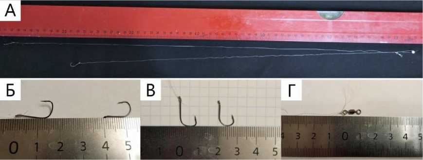 Рис. 4. А – снасть, в которой запуталась чайка, в общем виде. Б – крючки в длину. В – крючки в ширину. Г – вертлюжок