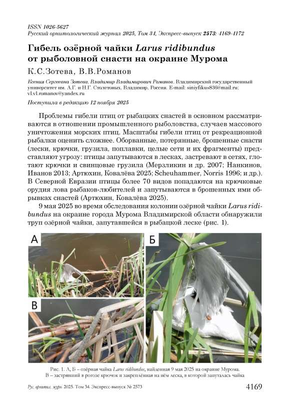 9 мая 2025 во время обследования колонии озёрной чайки Larus ridi-bundus на окраине города Мурома Владимирской области обнаружили труп озёрной чайки, запутавшейся в рыбацкой леске (рис. 1).