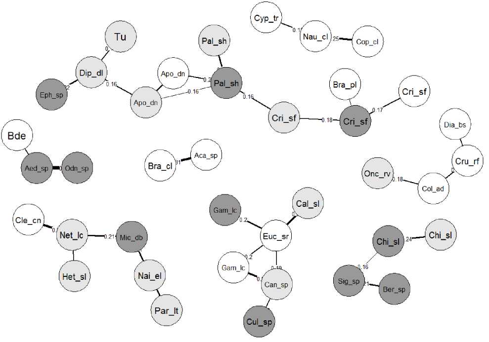 Fig. 1. Graph of a fragment of a partial correlation network of aquatic species. (Here and further in Fig. 2, the species codes are shown in the Table 2; taxa isolated from macrozoobenthos samples are marked in dark gray, meiobenthos in gray, and zooplankton in white (Zinchenko et al., 2020).