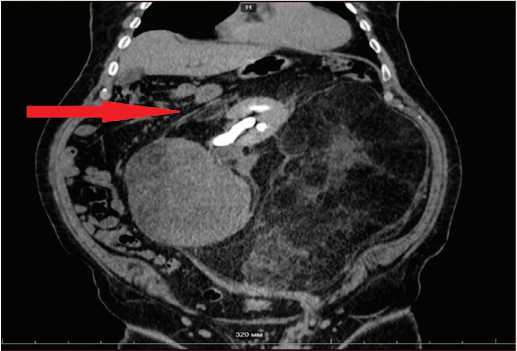 Рис. 2. КТ забрюшинного пространства (ретроперитонеальная опухоль) – коронарная проекция