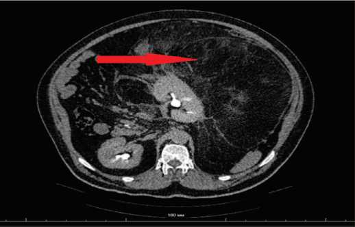 При мультиспиральной компьютерной томографии органов брюшной полости и малого таза с внутривенным контрастированием выявлено объемное новообразование неправильной формы жировой плотности с участками кальцинатов и тканевыми конгломератами, размерами 549×480×339 мм, с плотность в нативной фазе от –102 до +6 ед. HU, которое неравномерно накапливает контрастный препарат: в артериальную фазу – 16 ед. HU, в венозную – 21 ед. HU.