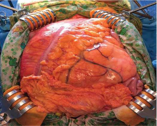 При ревизии брюшной полости выявлено тугоэластичное объемное образование желтого цвета, занимающее практически всю брюшную полость от диафрагмы до мочевого пузыря,размером примерно 50×40 см (рис. 4).