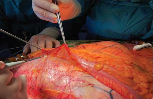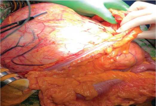 Fig. 4. Access to the abdominal cavity has been achieved. The descending colon and its mesentery are flattened on this neoplasm местами плотно сращена с опухолью, при ее выделении удалось сохранить сосуды, питающие кишку (рис. 5).
