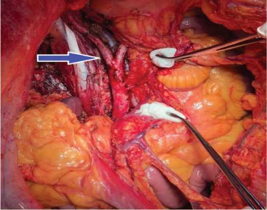 Рис. 4. Осуществлен доступ в брюшную полость. Нисходящая ободочная кишка и ее брыжейка распластаны на данном новообразовании