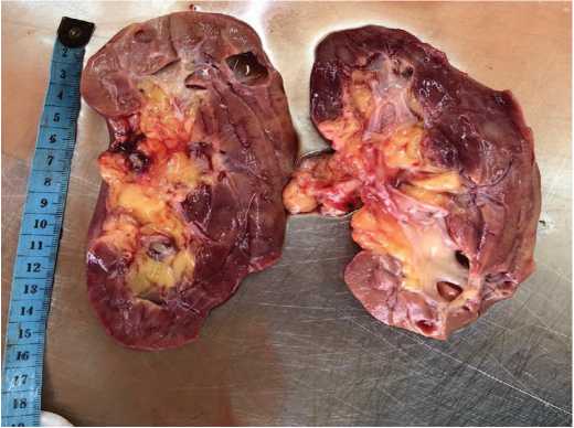 Рис. 10. Почка, выделенная из опухолевых масс (макропрепарат на разрезе) Fig. 10. Kidney isolated from tumor masses (macroscopic sectional view)