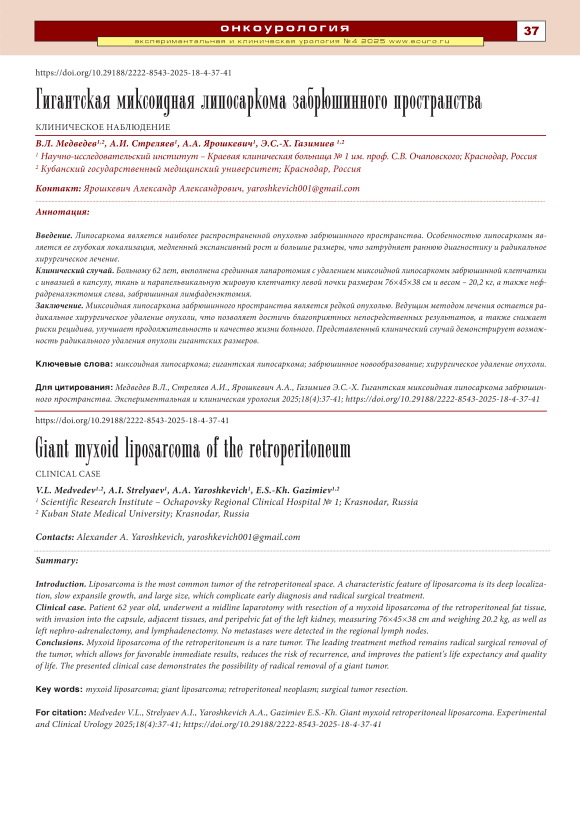 Введение. Липосаркома является наиболее распространенной опухолью забрюшинного пространства. Особенностью липосаркомы является ее глубокая локализация, медленный экспансивный рост и большие размеры, что затрудняет раннюю диагностику и радикальное хирургическое лечение. Клинический случай. Больному 62 лет, выполнена срединная лапаротомия с удалением миксоидной липосаркомы забрюшинной клетчатки с инвазией в капсулу, ткань и парапельвикальную жировую клетчатку левой почки размером 76×45×38 см и весом – 20,2 кг, а также нефрадреналэктомия слева, забрюшинная лимфаденэктомия. Заключение. Миксоидная липосаркома забрюшинного пространства является редкой опухолью. Ведущим методом лечения остается радикальное хирургическое удаление опухоли, что позволяет достичь благоприятных непосредственных результатов, а также снижает риски рецидива, улучшает продолжительность и качество жизни больного. Представленный клинический случай демонстрирует возможность радикального удаления опухоли гигантских размеров.