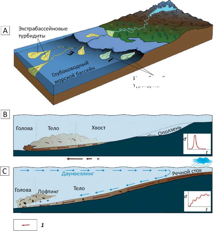 Кроме того, в последние десятилетия накопился обширный научный материал, подтверждающий связь образования турбидитов с прямой разгрузкой осадка в бассейн речными паводковыми водами в виде гиперпикнальных потоков [12–19].