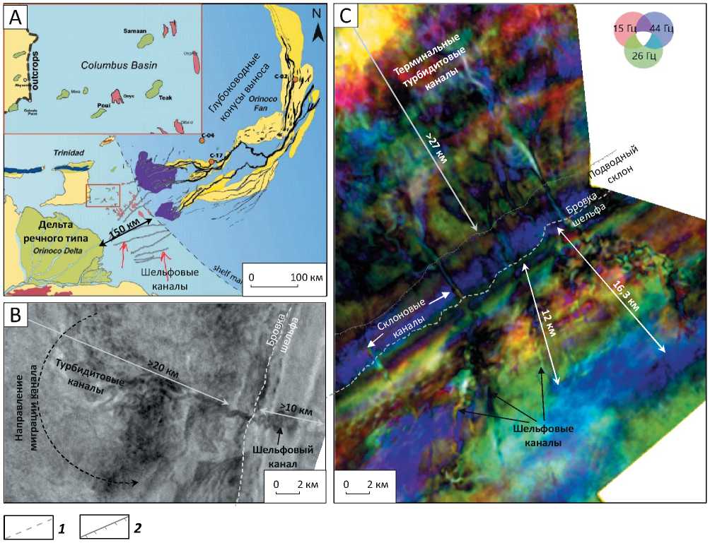 A — современные подводные каналы гиперпикнальных потоков дельты р. Ориноко (красные стрелки), переходящие в склоновые каналы, питающие подводный конус выноса. Поздний миоцен – плиоцен [12], B — непосредственный переход шельфового канала на бровке шельфа в склоновый канал, питающий крупный подводный конус выноса, проявляющего левостороннюю асимметрию (срез по амплитудному кубу. Ачимовская толща, Западная Сибирь), C — переход шельфовых каналов в склоновые каналы, питающие подводные конуса выноса у подножия склона (карта спектральной декомпозиции. Ачимовская толща, Западная Сибирь)
