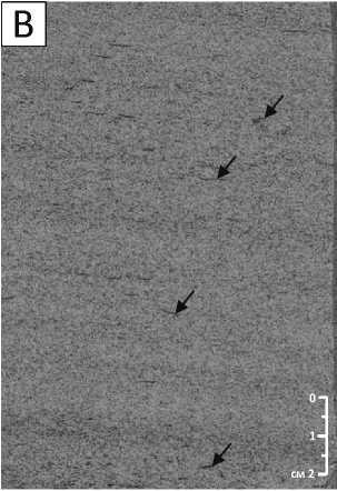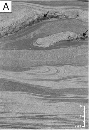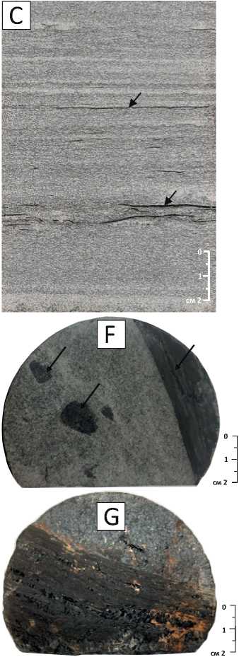 A — конседиментационные деформации (текстуры внедрения) в песчанике мелкозернистом мелкокосослойчатом и алевролите глинистом, содержащие крупный углефицированный растительный детрит (черные стрелки), B — рассеянный углефицированный растительный детрит в массивном мелкозернистом песчанике, проявляющего слабо выраженное полосчатое строение (гибридный поток), C — крупные обломки углефицированной древесины в песчанике мелкозернистом, характеризующемся неоднократными изменениями строения от горизонтально-слоистого к массивному, отражающими флуктуации в скорости гиперпикнального турбидитового потока, D — песчаник мелкозернистый с градационной слоистостью, подчеркиваемой рассеянным мелким углистым детритом (в нижней части образца), перекрывается выше тонко-горизонтально-слойчатым алевролитом, на который в свою очередь ложится массивный песчаник с крупным обломком углефицированной древесины (черная стрелка) в подошве, E — песчаник мелко-тонкозернистый с мелкой косой слоистостью со сдвоенными слойками (низ образца) и горизонтальной слоистостью (лофтинг ритмиты), подчеркнутой углистым растительным детритом, F, G — крупные обломки древесины (больше диаметра керна) в песчанике на сколах керна