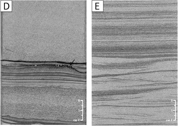 При седиментологическом описании отложений ачимовской толщи литотипы выделялись по структурному и текстурному признакам без привязки к какой-либо из существующих идеализированных текстурных последовательностей (Лови, Боума и Стоу [6]). Это связано с тем, что изученные ачимовские отложения не относятся по генезису к классическим турбидитам, строение которых отражает изменение гидродинамических свойств в условиях постепенно замедляющегося турбулентного гравитационного осадочного потока. Гипер-пикнальные турбидитовые потоки существуют более продолжительное время и характеризуются неоднократными изменениями скорости течения, что приводит к формированию осадков, строение которых не соответствует в полной мере идеали- зированным текстурным последовательностям, выделенным для классических турбидитов. Кроме того, при изучении турбидитовых отложений ачимовской толщи были выявлены слои гибридных потоков [7], а также признаки переработки турбидитовых осадков контурными течениями и внутренними приливами [8, 9], строение которых также не укладывается в текстурные схемы классических турбидитов.