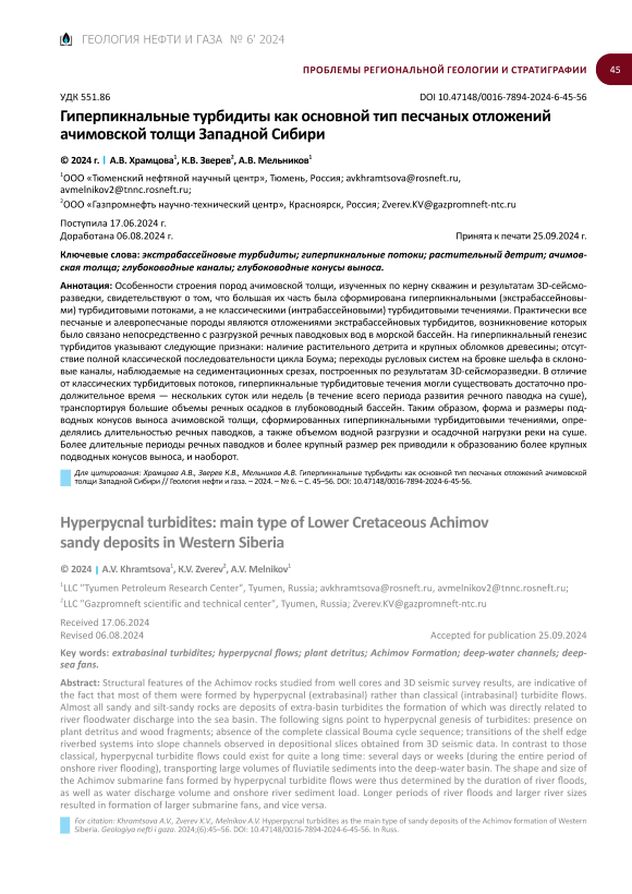 жин, и результаты 3D-сейсморазведки указывают на их образование гиперпикнальными (экстрабас-сейновыми) турбидитовыми потоками, возникновение которых было связано непосредственно с разгрузкой речных паводковых вод в глубоководный морской бассейн.