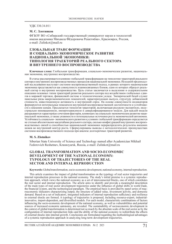 В статье рассматривается влияние глобальной трансформации на типологию траекторий реального сектора и внутренних воспроизводственных процессов национальной экономики. Исходной предпосылкой исследования выступает системно воспроизводственный подход, в рамках которого национальная экономика представляется как совокупность взаимосвязанных блоков, один из которых образует реальный сектор и внутреннее воспроизводство. Цель статьи заключается в выделении и содержательном описании основных типов траекторий развития реального сектора под воздействием глобальных сдвигов в мировой торговле, финансовой системе и технологическом укладе. Эмпирической базой служат панельные ряды макроэкономических показателей, характеризующих выпуск, структуру добавленной стоимости, инвестиционную активность и внутренний спрос. На основе совокупности индикаторов формируются интегральные показатели внутренней воспроизводственной достаточности и устойчивости к внешним шокам. Предлагается типология траекторий, включающая ресурсно-экспортную, индустриально инновационную, импортозависимую и диверсифицированную модели. Для каждой модели раскрываются характерные сочетания факторов, влияющих на социально экономическое развитие национальной экономики, а также уязвимости и потенциальные источники роста экономической автономии. Устойчивость социально- экономического развития в условиях глобальной трансформации определяется не столько абсолютными масштабами реального сектора, сколько конфигурацией внутренних воспроизводственных связей и способностью национальной экономики перераспределять результаты внешних шоков во внутренний контур роста. Сформулированы выводы о методологических преимуществах системно-воспроизводственного подхода при анализе долгосрочных траекторий развития.