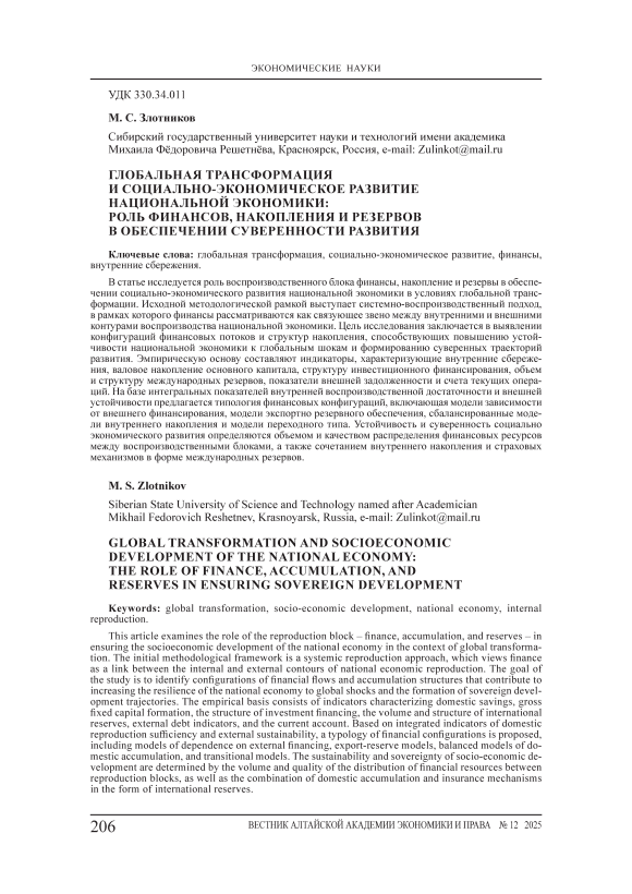 В статье исследуется роль воспроизводственного блока финансы, накопление и резервы в обеспечении социально-экономического развития национальной экономики в условиях глобальной трансформации. Исходной методологической рамкой выступает системно-воспроизводственный подход, в рамках которого финансы рассматриваются как связующее звено между внутренними и внешними контурами воспроизводства национальной экономики. Цель исследования заключается в выявлении конфигураций финансовых потоков и структур накопления, способствующих повышению устойчивости национальной экономики к глобальным шокам и формированию суверенных траекторий развития. Эмпирическую основу составляют индикаторы, характеризующие внутренние сбережения, валовое накопление основного капитала, структуру инвестиционного финансирования, объем и структуру международных резервов, показатели внешней задолженности и счета текущих операций. На базе интегральных показателей внутренней воспроизводственной достаточности и внешней устойчивости предлагается типология финансовых конфигураций, включающая модели зависимости от внешнего финансирования, модели экспортно резервного обеспечения, сбалансированные модели внутреннего накопления и модели переходного типа. Устойчивость и суверенность социально экономического развития определяются объемом и качеством распределения финансовых ресурсов между воспроизводственными блоками, а также сочетанием внутреннего накопления и страховых механизмов в форме международных резервов.
