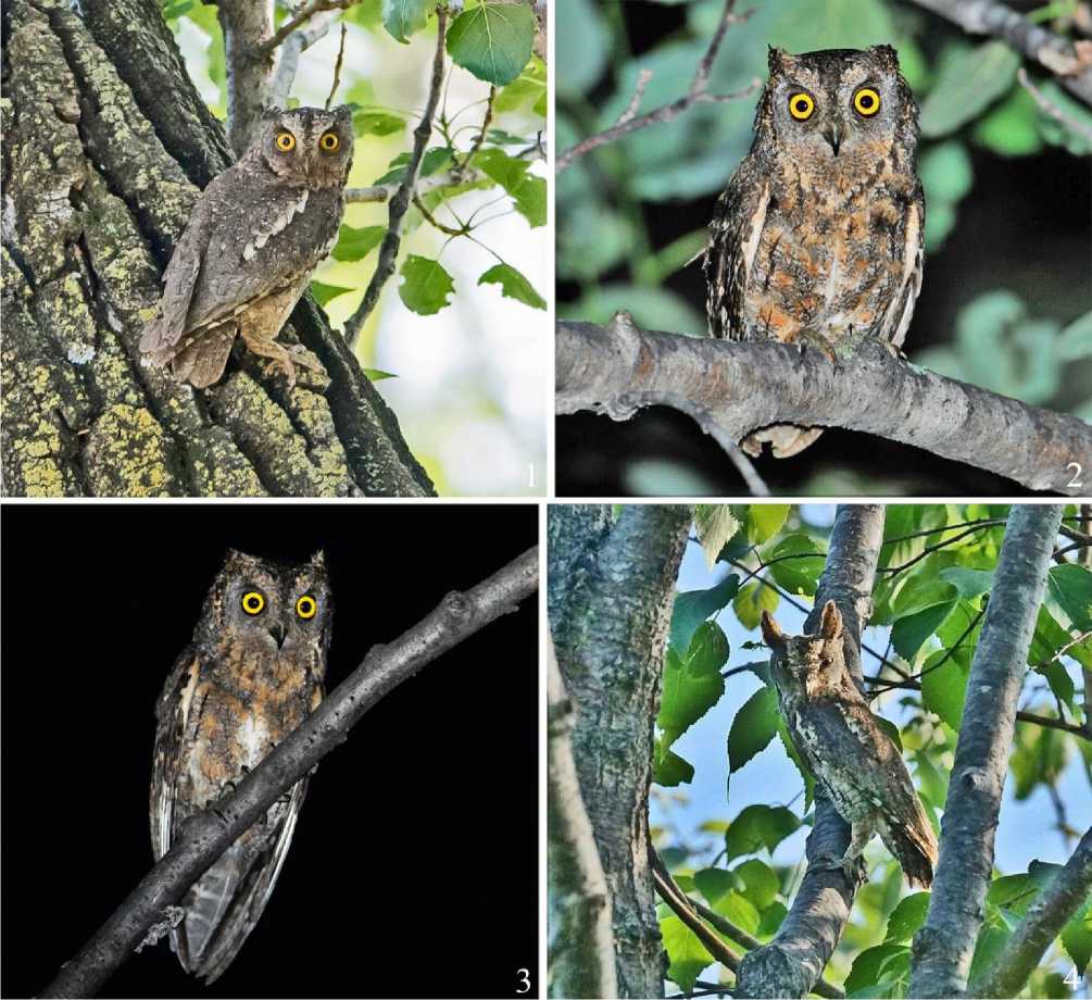 Рис. 1. Восточные совки Otus sunia stictonotus . 1 – Октябрьский район, село Чернятино, 1 июля 2020; 2 – Пограничный район, окрестности села Барабаш-Левада, 20 июля 2012; 3 – там же, 21 июля 2012, фото Д.В.Коробова; 4 – северное побережье Амурского залива, полуостров Де-Фриза, 28 мая 2022, фото А.П.Ходакова