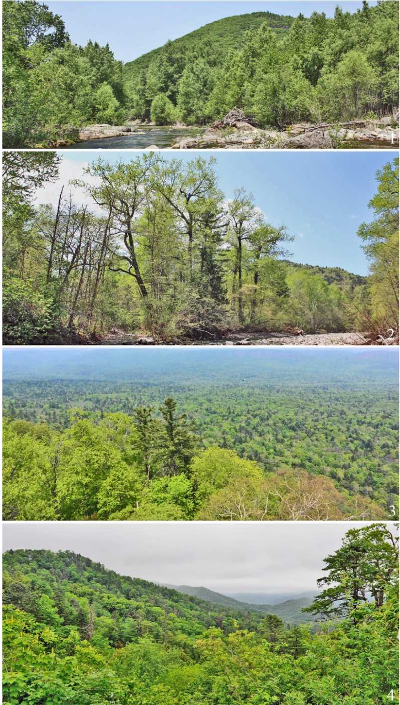 1 – Лазовский заповедник, долина реки Беневка, 7 июня 2011; 2 – Лазовский заповедник, долина реки Перекатная, 11 мая 2017, фото В.П.Шохрина; 3 – Борисовское плато, бассейн реки Грязная, 18 мая 2019; 4 – Южный Сихотэ-Алинь, перевал Серебряный, 7 июня 2016, фото Д.В.Коробова а на горе Высотная их наблюдали на высоте около 800 м (Панов 1973, с. 137). В бассейне реки Большая Уссурка плотность совок особенно велика в широколиственных лесах нижнего течения реки, несколько реже они встречаются в смешанных долинных лесах среднего и верхнего течения и ещё меньше этих птиц в крупных массивах ельников и разреженных лиственничников (Спангенберг 1965). По этой реке восточные совки густо заселяют все лесистые острова, лиственную тайгу сопок, тогда как в мелких дубовых перелесках и группах крупных деревьев низменности их не наблюдали (Спангенберг 1940).