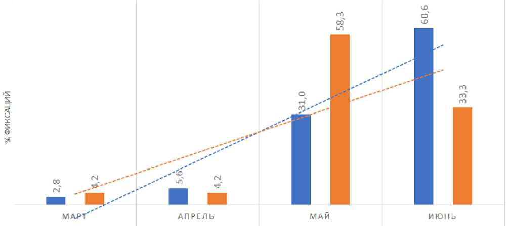 В наступающих сумерках ещё дважды, 27 и 28 июня, слышали негромкий голос неясыти, а 3 и 4 июля непродолжительные их поиски на гнездовом участке ни к чему не привели. Видимо, совы переместились в другую часть леса. Таким образом, период от первой до последней регистрации длиннохвостой неясыти составил в 2025 году более 3 месяцев, а количество дней регистрации этих сов – 27 (см. таблицу). С марта по июнь было 24 голосовых и 71 визуальная фиксация птиц (рис. 6).