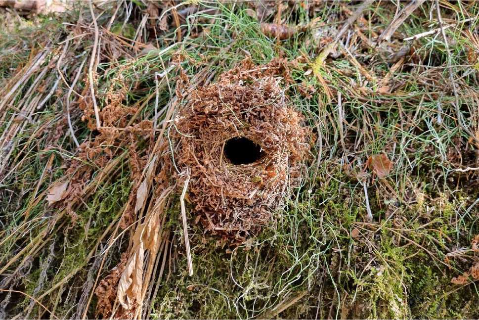 Рис. 2. Гнездо крапивника Troglodytes troglodytes , расположенное на вертикальном склоне берега ручья. Городские леса Ханты-Мансийска. 08.05.2025. Фото автора
