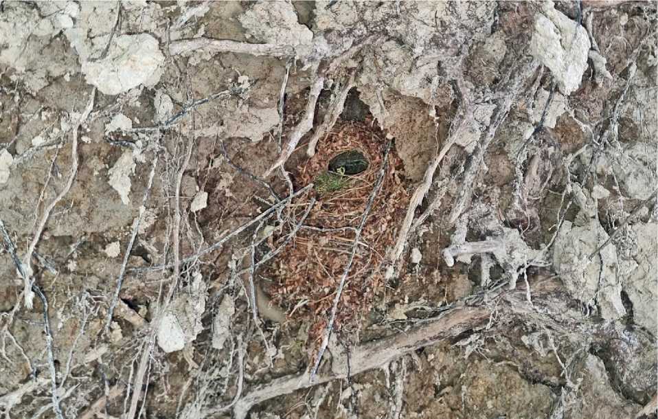 Рис. 5. Гнездо крапивника Troglodytes troglodytes , расположенное в подошве выворотня. Городские леса Ханты-Мансийска. 14.05.2025. Фото автора