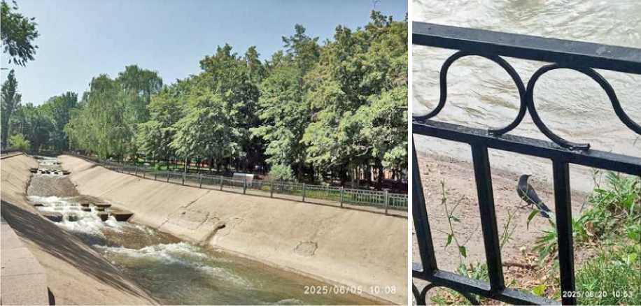 Рис. 2. Вид от гнезда на речку и парк на её левом берегу. Справа – доросшая молодая синяя птица Myophonus caeruleus у воды. Алматы. 20 июня 2025. Фото автора