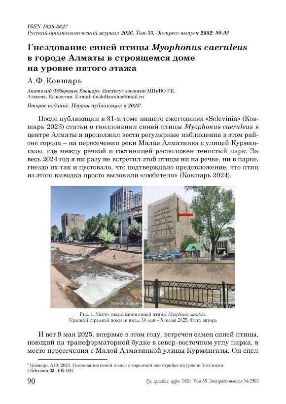 После публикации в 31-м томе нашего ежегодника «Selevinia» (Ков-шарь 2023) статьи о гнездовании синей птицы Myophonus caeruleus в центре Алматы я продолжал вести регулярные наблюдения в этом районе города – на пересечении реки Малая Алматинка с улицей Курман-газы, где между речкой и гостиницей расположен тенистый парк. За весь 2024 год я ни разу не встретил этой птицы ни на речке, ни в парке, гнездо их так и пустовало, что подтверждало предположение, что птиц из этого выводка просто выловили «любители» (Ковшарь 2024).