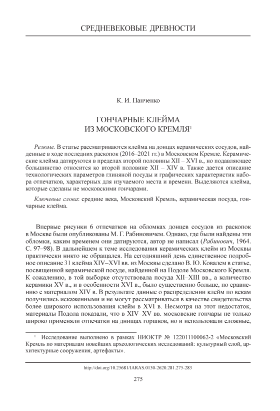 The paper explores stamps on the bottoms of clay pots found in the course of the latest excavations (2016–2021) in the Moscow Kremlin. Pottery stamps are dated within the second half of the XII–XVI centuries; however, most stamps date to the second half of the XII–XIV centuries. The paper also contains description of technological traits of the clay pots as well as graphical characteristics of the set of stamps typical for the studied location and the analyzed period. Marks made by non-Moscow potters have been singled out.