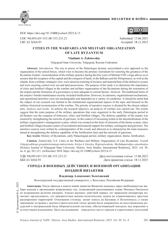 После прихода к власти новой династии Византия оказалась перед необходимостью выбора подхода к организации вооруженных сил, позволяющей реализовывать планы Михаила Палеолога по возращению величия империи. Анализ военных действий первых лет правления императора позволяет предположить, что приоритетные военно-политические задачи не ограничивались простым расширением территорий. Отвоевание столицы, захват земель на Балканах и Пелопоннесе, а также завоевание островов с военно-стратегической точки зрения были направлены на восстановление ресурсной и материальной базы оборонительной системы, обеспечивающей контроль над морскими и сухопутными владениями. Цель исследования – определить место городов и укрепленных поселений в военных действиях и военной организации поздней Византии в период восстановления империи и формирования системы управления, адекватной новым военно-политическим условиям. Анализ военной практики показал, что основной целью кампаний, организованных в раннепалеологовский период на всех театрах военных действий, был захват крепостей, городов и укрепленных поселений. Основной задачей было обеспечение обороноспособности империи за счет укрепления цепи гарнизонов. В ходе исследования было установлено, что в условиях усиливающихся тенденций децентрализации системы управления военной организацией, созданной на основе элементов фемного строя, города и укрепленные поселения становились центрами комплектования и материального обеспечения воинских контингентов и гарнизонов. На основе сведений современников событий были выделены и охарактеризованы основные мероприятия, направленные на усиление обороноспособности фортификационных линий и цепи гарнизонов.