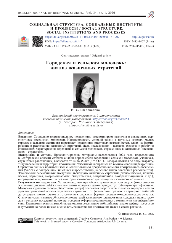 Введение. Социально-территориальное неравенство детерминирует различия в жизненных перспективах российской молодежи. Неоднородность условий жизни в крупных городах, малых городах и сельской местности порождает неравенство стартовых возможностей, влияя на формирование и реализацию жизненных стратегий. Цель исследования ‒ выявить сходства и различия социальных характеристик городской и сельской молодежи, отраженных в жизненных диспозициях и стратегиях. Материалы и методы. Проанализированы материалы исследования 2023 года, проведенного в Белгородской области методом онлайн-опроса среди городской и сельской молодежи (учащихся, студентов и работающих) в возрасте от 14 до 35 лет (n = 5 881). Выборка квотная по полу, возрасту, типу поселения и территории проживания. Участники набирались по технике «горячий рекрутинг». Обработка данных производилась с использованием профессионального программного обеспечения (Vortex), с построением линейных и кросс-таблиц (на основе типов поселений респондентов). Зависимыми переменными выступили двенадцать жизненных стратегий (экономическая, политическая, карьерная, матримониальная, общественная, миграционная, самореализационная и др.), операционализированных через категории «жизненные диспозиции» и «жизненные планы». Результаты исследования. Установлено, что при общем ценностном консенсусе (гомогенности жизненных диспозиций) жизненные планы молодежи демонстрируют устойчивую стратификацию. Молодежь крупного города (областного центра) опережает сверстников из малых городов и сел по уровню притязаний во всех изученных стратегиях: от финансовых практик и карьерных амбиций до репродуктивных планов и готовности к сложным формам социально-политического участия. Статистически значимое сближение показателей жизненного планирования молодежи малых городов и сельских поселений позволяет говорить о формировании единого континуума «периферийности». Главными механизмами, блокирующими реализацию амбиций, выступают дефицит ресурсов и субъективно более низкая оценка возможностей для достижения целей в своем регионе. Обсуждение и заключение. Поселенческий фактор является значимым механизмом стратификации, воспроизводящим неравенство на уровне практической реализуемости жизненных проектов. Разрыв в сложности и масштабе планирования между центром и периферией создает риски дальнейшей концентрации человеческого капитала в крупных городах и депопуляции малых территорий. Материалы статьи могут быть востребованы органами управления государственной молодежной политикой разного уровня, а также государственного и муниципального администрирования; молодежными организациями; образовательными учреждениями.