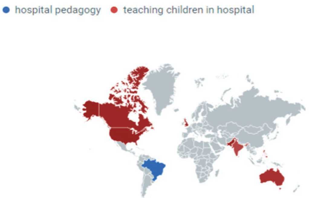 Значительное количество онлайн-запросов пользователей сети Интернет по термину «hospital pedagogy» характерно для жителей Сингапура, Бразилии, Индии, Австралии. Начиная с 2010 года число обращений идет на спад, и примерно с 2019 года частотность онлайн-запросов вновь начинает возрастать. Интенсивное обращений в интернет-среде к термину «teaching children in the hospital» прослеживается в таких странах, как: Пакистан, Филиппины, Великобритания, Соединенные Штаты Америки. Популярность рас-