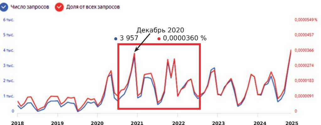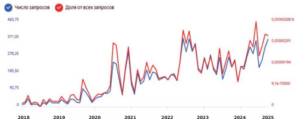 COVID-19 в России. Но мы можем лишь предположить, что данное событие в значительной степени повлияло на интенсивность обращений к рассматриваемой области педагогики. В дальнейшем наблюдается колебание количества поисковых запросов, а в июле 2025 года оно резко возросло.