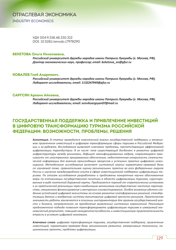 Цифровая трансформация туризма, государственная поддержка, привлечение инвестиций, нормативно- правовая база, региональное развитие, иммерсивные технологии, национальные проекты, проблемы цифровизации