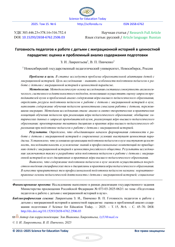 Готовность педагогов к работе с детьми с миграционной историей в ценностной парадигме: оценка и проблемный анализ содержания подготовки